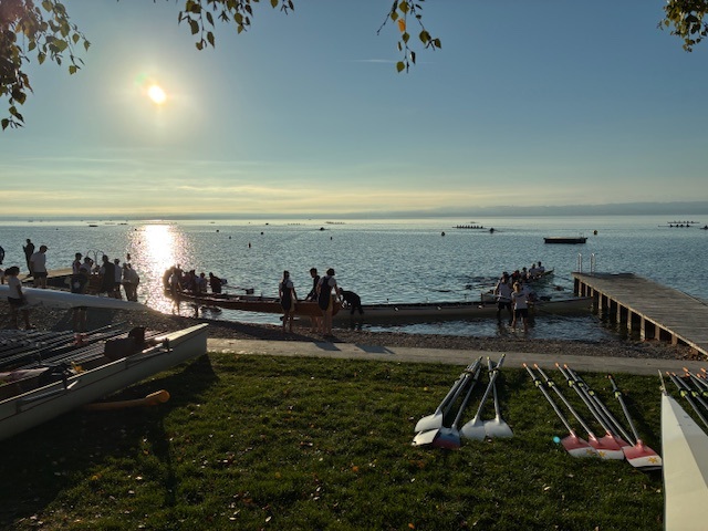 Die Boote wurden abgeladen und bereit gemacht für die Regatta. Die erste Herausforderung war dann das Einsteigen im Wasser. Dank des warmen Wetters trockneten wir rasch wieder.